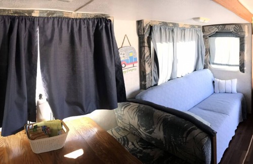 Cozy trailer tucked away in our charming backyard retreat. Our home is a 1 acre fenced in yard. We have the most beautiful sun rises and sunsets in the mountains. Our yard is surrounded by fruit trees (apples, apricot, plum & nectarine). Please help yourself when they are in season. Enjoy the front and back patio, have a glass of wine and enjoy the sunset.