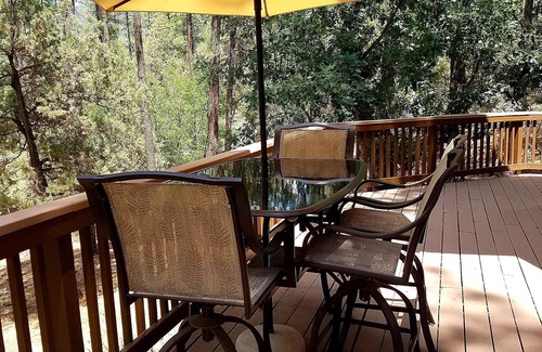 Our cabin is located in Pine, Arizona, within walking distance to restaurants, grocery store, and antique shops. 2 story, 2 Bed, 2 bath, 1387 square feet, sleeps 6. Both bedrooms are on the second floor. New enclosed wrap around TREX composite deck with propane gas grill. There's plenty of seating for you to enjoy the beautiful mountain views, Mogollon Rim, wildlife, and relax to the whispering pines. Quiet corner lot with parking for 4 vehicles. Cabin has been completely remodeled with new flooring, furniture, fireplace, kitchen appliances, and all the creature comforts of home. New Mitsubishi 3 unit split system for A/C and heat. Living room has vaulted ceilings with a propane gas log fireplace. New 65 inch Sony Smart TV w/Blu-ray. Queen size sleeper sofa with upgraded memory foam mattress.