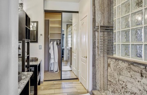 The large main floor Master Bedroom has a king size bed, walk-in closet, open concept bathroom with double sinks, walk in shower with multiple shower heads, heated towel rack and separate toilet room.