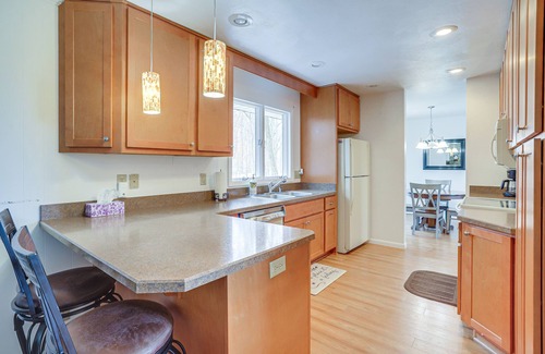 KITCHEN: Dishwasher, stove/oven, refrigerator, microwave, drip coffee maker, dishware + flatware, cooking basics, trash bags + paper towels, bar seating