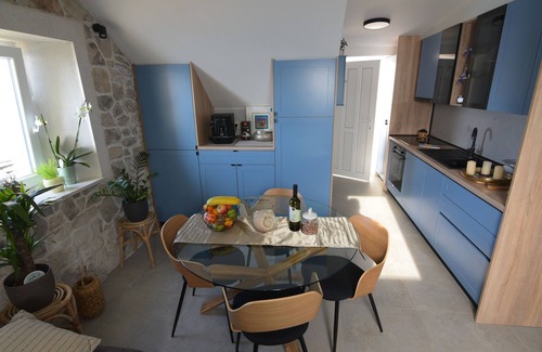 The house is located in a peaceful cove called 'Borak', with several pebble beaches under the shades of pine trees, and with freshwater spring. It was built in 1911. as a wine cellar for keeping the red wine which was the main agricultural product of this area in that time. Over the time, the wine production has almost disappeared, and the house was little by little adapted to serve as a holiday house. The renovation was made in the year 2012, when we prepared one apartment on the first floor for our guest. The first phase of the renovation was made in the year 2012 and we were very proud to present you with our offer of accommodation in a holiday apartment on the first floor of the house. In year 2014. we renovated the roof, the attic and the facade of the house in traditional style and in year 2024 we have fully completed the apartment in the attic which we now rent together with the apartment on the 1st floor as one duplex apartment for 8 persons.