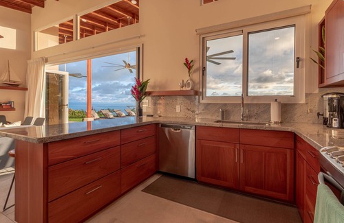 Fire up the BBQ and dine under the stars, or let a private chef craft a locally inspired gourmet dinner to celebrate a special occasion. The fully stocked kitchen features high-end appliances, quality cookware, and a large island with bar seating—perfect for casual meals or cocktails.