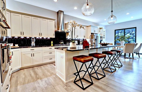 Luxury awaits you on the shoreline of Table Rock Lake! This professionally decorated, 5-bedroom + bunkroom lakefront home is the perfect escape for all family getaways. Each room in this modern home is meticulously designed to be an ideal space of coziness and relaxation. Enjoy a luxurious master suite, open floor plan, entertainer’s kitchen, gas fireplace, huge balconies, home water filtration system, and high-end finishes throughout. Your guests will have all the comforts of home with luxury sleeping arrangements, including 4 king beds, 2 queen beds and a twin bunk bed. Enjoy the outdoor balcony space when cooking on The XL Big Green Egg Grill and relaxing on the outdoor furniture, including a luxury bed swing.