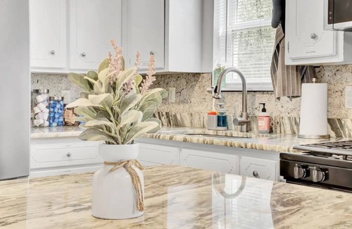 Fully appointed kitchen with appliances, including stove, oven, refrigerator, dishwasher, and microwave. Bedrooms are comfortably furnished with beautiful crisp new linens, pillows, and bed coverings. Spacious living room includes comfy sofa, 60" Smart HDTV, private backyard with patio and outdoor furniture, free high-speed Wi-Fi, onsite parking, and keyless access.