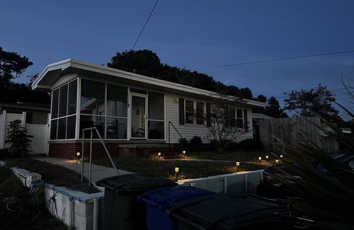 Nestled in a tranquil neighborhood, our bungalow offers a peaceful escape from everyday life. The fully equipped kitchen provides everything you need to prepare delicious meals. We provide chairs, umbrellas, games, and towels to enhance your beach experience. Unwind on the spacious screened-in porch, complete with a fire pit, perfect for cozy evenings.