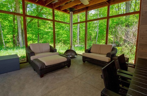 Spend your mornings exploring the property’s 1.5 miles of private roads, perfect for strolling or biking, or venture out for a hike through the expansive acreage. Challenge yourself to spot different species of birds, or simply enjoy the beauty of the land. After a day of adventure, retreat to the 400+ sq. ft. screened porch, where you can unwind around the wood-burning fire while stargazing into the night.