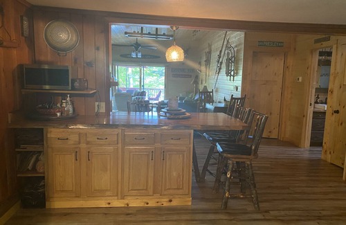 Pia's Place - Our newly renovated 4 season knotty pine Northwoods home on North Two Lake, is the perfect lakeside retreat or winter get away with family and friends for rousing game nights or quiet evening cocktails by the fire-pit. Our home boasts three bedrooms and three full bathrooms with space for up to six guests, and lots of great spaces to spread out and relax. A large fieldstone fireplace graces a family room overlooking the 144 acre lake, and two outdoor fire-pits offer a chance to unwind beside a crackling fire. A wraparound deck holds lounging chairs for catching some rays and reading that novel that everyone on BookTok is raving about, or napping the afternoon away in preparation for a trip to Minocqua for a great Northwoods Supper Club experience. Don't forget to head out to Lake Tomahawk on Monday night for our famous Snowshoe Baseball! Be sure to get there early, though- the concession stand boasts the best selection of home baked pie (yes, pie!! Don't miss the strawberry rhubarb) in the world and slices sell out fast! Our home offers a fully equipped kitchen and live edge countertopped island with seating for 4 and a large dining table for meals when everyone is together. In the upstairs family room, there's a big TV for snuggling in with a movie on rainy days, and our home also has a big family room downstairs for a cutthroat game of Monopoly. On a sunny afternoon, grab one of our kayaks or paddle boards and paddle the lake- you might spot an elusive Loon calling to it's mate!