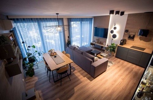 This air-conditioned, two-level apartment with a Jacuzzi on the balcony is suitable for 6 people - an ideal choice for a family getaway or a group of friends. The highly functional space offers a living room combined with a kitchenette and dining area, two bedrooms with a double bed and a bathroom with a shower. The apartment includes a balcony equipped with comfortable garden furniture, so you can spend warm summer evenings in the company of mountain landscapes, and additionally relax in the Jacuzzi. Multimedia in the apartment includes three flat-screen TVs and access to high-speed free Wifi. A wide range of amenities and comprehensive furnishing of the apartment with necessary kitchen and bathroom accessories and appliances guarantees a comfortable stay. A complimentary set of toiletries (soap, shampoo and shower gel), towels and linens are provided to facilitate the start of each visit. The apartment is distinguished by careful finishing and modern design in various shades of gray combined with wood accents, which creates a unique atmosphere. The interior is elegant and functionally designed, meeting all the needs of guests. There is an option to bring your favorite pet for the trip, as the property accepts pets.