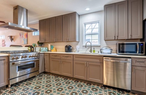 Luxury 3 bed/2bath w/ Private Cowboy Pool, Firepit & BIG backyard @ Casa Pajaritos, next to Blue Star Arts Complex, alongside historic Riverwalk trails in downtown San Antonio! Fully renovated with luxury finishes, free-standing spa bathtub, modern kitchen, king-size bed, bocce ball, + more!