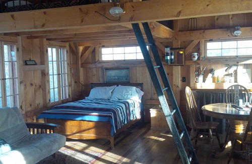 Extremely private one of a kind hand-built Post and Beam Cabin overlooking the Hudson River valley and the mountains of Vermont. Situated atop a beautiful rise on a 100 acre horse farm. Completely insulated and heated by an air tight woodstove. The cabin has NO electricity. My wife and I supply propane lanterns, propane and a 2 burner propane stove. Please bring your drinking water. We supply clean water for washing and a large cast iron Dutch oven for cooking over the fire on the outdoor fire pit. There is a clean, quaint outhouse next to the cabin, and an outdoor solar shower for use in warm weather. There is a kitchenette with a sink that you can pump water into by hand. For sanitary reasons we are now providing single use plates, cups and utensils. Please feel free to bring your own if you wish. If you plan on cooking over the fire please bring firewood. Don't be afraid of cold weather. Many travelers (as well as ourselves) have spent several nights there in Sub zero (f) weather. We would compare this to very comfortable and rustic indoor camping. The cabin has a 'full' bed and futon on the bottom floor. There are two twin beds in the loft. This is an experience you HAVE to try. EVERY traveler raves about their time spent here. If you need to unwind and spend some time relaxing off the power grid this is a must do. There is excellent cellular coverage from AT&T and Verizon. PS. there are outlets available in the barn to charge battery operated devices.