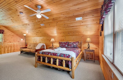 This cabin sleeps 10 guests, with a main-level bedroom boasting a log-style queen bed. The spacious loft area sleeps four guests in a queen bed and queen futon. The lower level game room has a twin-over-twin bunk bed and a queen futon. There is a full bathroom located on each level.