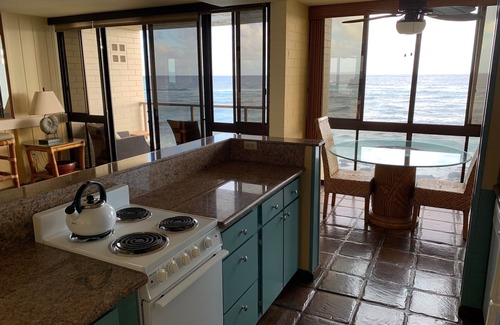 Kuhio Shores 213 is a quiet, oceanfront condo with stunning views from your balcony where you can watch both sunrise and sunset. Kuhio Shores 213 is on the 2nd floor located in the exact center of the south-facing building and juts out a little further than the neighboring units providing unobstructed views of the ocean and complete privacy. From your balcony, you will see surfers, turtles, marine life and even whales between December and March. The natural sound of the ocean waves will lull you to sleep.