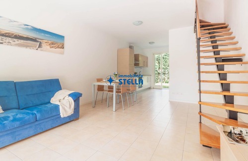 Villa on two levels with independent entrance and composed of entrance into large living room with sofa bed, kitchen complete with oven and dishwasher, first bathroom with window with shower and washing machine.