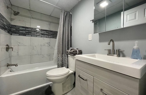 This new construction has an open layout with a welcoming living room, 2 bedrooms, and an eat-in kitchen complete with black stainless steel appliances, quartz countertops, recessed lighting, and under-lit cabinets. The bathroom has a tiled floor, glass shower, new faucets, fixtures, and a pedestal sink. The unit is equipped with high-speed internet, a smart TV, central heating, an entrance deck, and private parking. Perfect for UMass Medical, Bio-tech, and local stays!