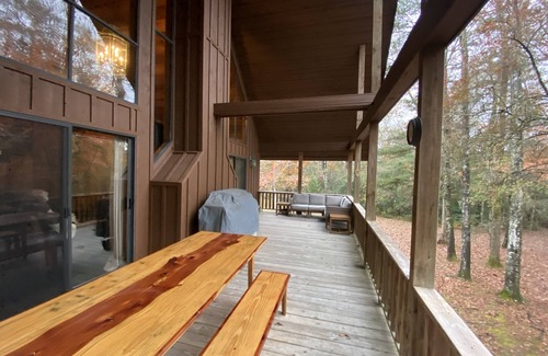 You will have full access to the entire house minus 1 utility room. There is a hangout area under the house and a propane bbq pit and seating area on the covered balcony/porch area. There is a small walking trail through the woods and a nice fire area to roast s’mores.