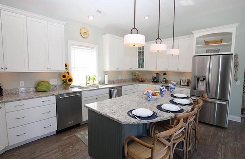 More kitchen details to help make your time here as care-free as possible: The huge kitchen includes pantry areas plenty of cabinets for guest use; seating for four at the kitchen island; state-of-the-art appliances including two stand-alone ice makers, an extra-large capacity refrigerator, two dishwashers, a large microwave and oversized sink. It s fully stocked, including things like both drip and Keurig coffee makers, a toaster, broiler-oven, an extra large slow cooker, seafood utensils, multiple baking supplies, etc.