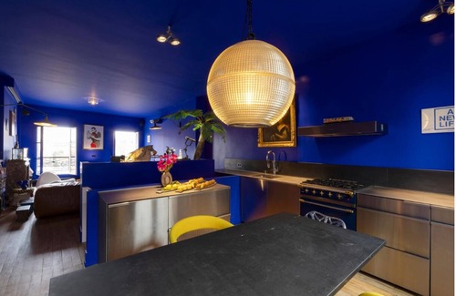 Inside, the eclectic blend of rich classical paintings, bespoke mid-century furniture, and artisanal décor creates a sophisticated yet inviting atmosphere. Plush furnishings and luxurious textiles elevate the space, making it feel more like a private Parisian palace than just an apartment. Every detail is thoughtfully curated, ensuring a visually stunning and comfortable environment.