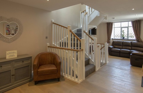 Experience cosy elegance with our hot tub, nestled in this quaint cottage's courtyard, offering serene relaxation amidst charming surroundings. Your perfect retreat awaits. Recently renovated, this quaint character cottage sleeps up to 4 adults in 2 crog loft-style bedrooms with Juliet Balconies, mood lighting and Smart TVs. The spacious lounge boasts leather corner seating with recliners, feature electric stove-fireplace, large Smart TV and reading corner. On the ground floor, you will find a large modern kitchen with wine cooler, dishwasher, farmhouse table and further mood lighting. The Kitchen leads out to an ample Welsh-slated terrace with outdoor furniture, Covered hot tub with views of the Mur Gwenyn Stream