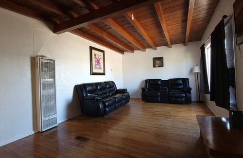 Adorable stucco home decorated with a splash of Southwest enchantment. Soak in every moment of this cute 1950's home with the original wood flooring throughout and the mesmerizing redwood ceiling. Just enough space for your short stay in this three bedroom sparsely furnished home with a small work area for your needs. Moreover, enjoy the long summer evenings in the large clean basic backyard equipped w/ a BBQ grill or simply to relax by gazing into the clear blue skies of the Uranium Capital.