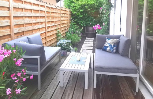 What distinguishes our 2-civil apartment, is the secluded wooden deck with a small flower and herb garden and the absolute quiet, sunny position on a nature reserve. The sights are within a few minutes by bus / car / bike rentals.