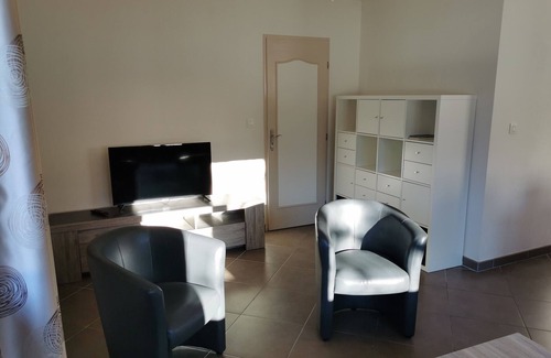 Single storey chalet with a large furnished and equipped kitchen opening onto a lounge area with flat screen TV and a 140*190 sofa bed.