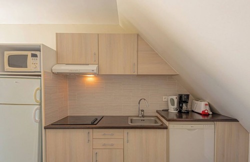 Apartment 3 rooms 5 persons - 46 metersKitchen Area: Equipped with a ceramic hob, microwave oven, fridge-freezer, dishwasher, coffee machine, and toasterLiving Room: Features a flat-screen TVGround Floor Bedroom: Includes a double bed and TVUpstairs Bedroom: Contains two single beds (80 x 190 cm) and a pull-out bedBathroom: Comes with a shower and integrated toiletTerrace: Furnished with garden furniture and a parasol