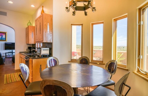 Retreat to the desert landscape of Rancho de Taos while staying at this adobe-style getaway boasting panoramic views and quiet seclusion within the gated community of Taos Country Club. Create memories of shredding the slopes of Taos Ski Valley or playing a sunrise game of golf. Day trip to Santa Fe to visit the Georgia O'Keeffe Museum and dine on local cuisine. At the end of the day, return to your home away from home nestled in the Soul of the Southwest and take advantage of the firepit, gas grill, and outdoor furnishings to host a cookout. Later, retreat to the back porch and unwind in the rejuvenating hot tub as the stars come out.