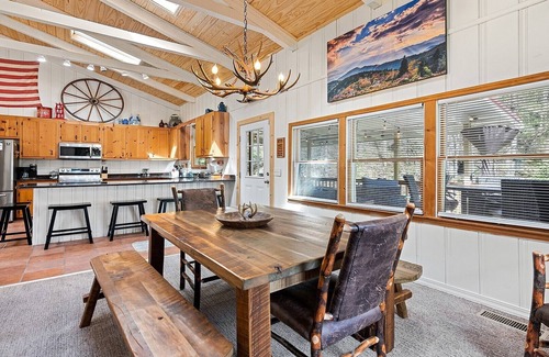 Under its vaulted main floor ceiling, you’ll find a large open combined living, dining and kitchen area complete with sprawling overstuffed couches, large family dining table and breakfast bar. This great room is centered conveniently around a beautiful stone gas fireplace and big screen TV. Adjacent to the living area is also a separate card table just ready to see who can complete that 1000-piece puzzle or any of the onsite games available. Still working from vacay? Plug in at your own workspace complete with standalone monitor and get back to the grind if just for a minute. The kitchen space is a cook’s dream with plenty of space to create everyone’s next best meal or whip up a short order from the crowd.