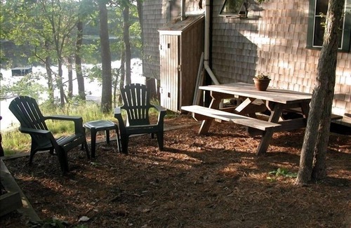 Nauset Haven on Minister's Pond is a private waterfront cottage community nestled among the pines. Just 2.5 miles from both the ocean and bay beaches, our cottage is a blend of privacy and convenience. It offers waterviews and homey comfort in a beautiful Cape Cod setting. Participants in the CAPE COD SYMPOSIUM (1/2 mile away) and the CAPE COD INSTITUTE (2.4 miles away) have raved about this relaxing alternative to a motel room. Enjoy your meals overlooking Ministers Pond, a 21 acre freshwater kettle pond with it's own beach, dock and swimming platform. Take out one of the rowboats for a trip around the pond or some freshwater fishing. Nap under the pines in our hammock or barbecue on the patio. On those occasional cool cape nights cozy up to the wood-burning fireplace.