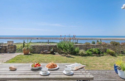 Entering this former coastguard cottage, which is steeped in history yet equipped with modern amenities, you are greeted by a small but practical kitchen. Here, you'll find everything you need to cook up a hearty breakfast or evening meal. The open plan living/dining room awaits, featuring French doors that lead onto the patio and offer a view you will never tire of. The living room provides a cozy space to relax, with comfy sofas, a smart TV, and a wood burner. Take the stairs to the first floor, where you will find two bedrooms. Bedroom one boasts a private balcony with uninterrupted views across Chesil Beach and beyond, perfect for soaking in the stunning scenery. Bedroom two features a charming captain's double bed. The bathroom, servicing both bedrooms, offers the luxury of a roll-top bath and a separate shower cubicle.