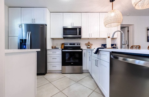 You will have everything that you need to make your stay as comfortable as if you were in your own home. You are just steps from Gulf Shore Park, where you will find fitness enthusiasts, pup parents, and small craft boaters. You will have access to 2 1-person kayaks and paddleboard that you can drop into the gulf at the park. While relaxing in this renovated paradise, you will love all of the options available to get outside and enjoy the Florida weather... relax and unwind in the spa, hang with friends around the firepit, cook up some barbeque on the grill, enjoy your favorite beverage on the screened patio, have some lunch in the tropical front yard in between the trees, or enjoy your coffee on the covered front porch, the possibilities are endless. Backyard is not fully fenced.