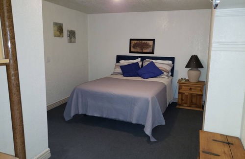 Our quaint apartment has a queen bed, TV in the master and a queen bed in second bedroom. Amenities include refrigerated air, full size washer and dryer, private lit gated parking with security camera, Wi-Fi, a Roku Smart TV with a complete kitchen with full size stove/oven, dishwasher, microwave oven and toaster oven.