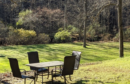 Property sits on 2 acres with small stream about 6 inches deep. Access to full private backyard (not fenced in) dogs should be kept on leashes. Deck and patio furniture available (except during winter months)