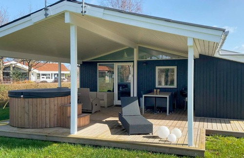 Layout: open kitchen(cooker(electric), hood, coffee machine, microwave, dishwasher, fridge, freezer(60-99L), washing machine), Living/bed room(TV(satellite, german television channels, danish TV channels (DR1 and TV2)), DVD player, radio, CD player), bedroom(double bed), bedroom(2x single bed), bedroom(2x single bed), bathroom(washbasin, shower, toilet), game computer, bath tub(outside, 6 persons), heating(electric), terrace, terrace(roofed), garden furniture, air to air heatpump