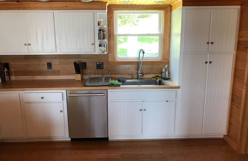 Cozy renovated 4 bedroom 2 bath cottage, with wraparound deck facing 50 ft west shore exclusive lakefront, private dock and 8 ft fire pit with firewood. Very short and level walk on lawn from cottage to the lake. Fully equipped kitchen, gas and charcoal grills, 2 full bathrooms, 4 bedrooms upstairs (5 beds - 3 queen, 1 full, 1 twin - and full futon couch in loft) and convertible pullout queen couch in downstairs living room. Central AC, working fireplace, WiFi, cable TV, canoe and kayaks, boat moorings, plenty of parking, towels and linens included, washer/dryer. Beautiful spot!