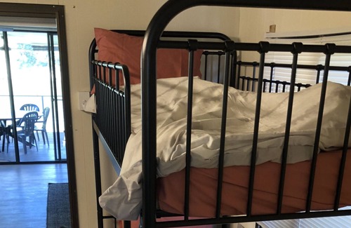 Water Front Cabin , on the Majestic Hawkesbury River , 1 small bedroom , 1 large bedroom , sleeps 6 comfortably , full stainless steel kitchen , 2 fridges , loads of storage , Large Bathroom / Laundry , shower , toilet , vanity , washtub , washing machine ,large lounge room 7 mtr x 7.5 mtr , wall mounted flatscreen TV , WIFI , Gas Hot Water , Gas Cooking , Gas BBQ , Front Deck , with sink and hot /cold water , large round dining table on front deck , seats 8 overlooking the river ,outdoor Shower with hot/ cold water , under cover parking , Pontoon on River front , Boat Ramp Available . Pet Friendly , must be kept under control as other dogs in park , Bring the Family , Bring the Boat and enjoy all the River has to Offer !
