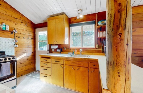 The cabin is a showcase of its natural surroundings, thanks to a western wall of windows framing the river and mountains. Wood-paneled walls and exposed ceiling beams give the house plenty of atmosphere, which you'll feel whether you're cooking in the kitchen or watching movies by the woodstove.
