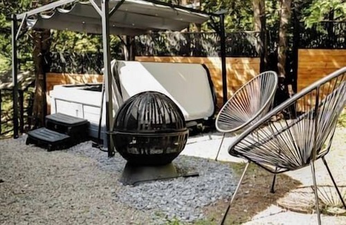 An impressive stone fireplace furnishes almost an entire wall of the loft. An outdoor fireplace is also available to brown marshmallows and a BBQ (charcoal not provided) for your grills! Find an outdoor spa available year round and a double Jacuzzi in the remodelled bathroom. A large smart TV in the living room allows you to watch Netflix and YouTube, among others.