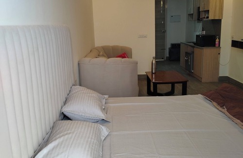 its studio appartment located at yamuna expressway in gaur yamuna citi with all amenities and adjoining lake park and half way to agra tajmahal from delhi to agra.mathura varindavan so its good to stay for allkind of travelers choice.