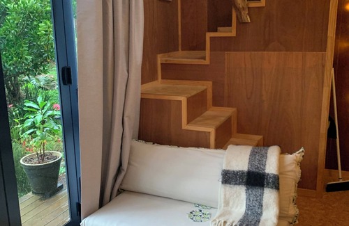 Enjoy your Getaway in this stylish, creative little cabin. Set on an acre, in the foothills of the Waitakere Ranges, West Auckland, tucked away from the family home, you can sit on the deck and watch the clouds drift by or get out and about in the wild of the bush and beaches. Come home to a hot outdoor bath by the plum tree. The loft bed with skylight is very popular - it's 'dreamy'. You will be greeted by fresh flowers from the garden. Local Armour Bay is perfect for a stroll and there are waterholes 10 minutes away at the Karamatura valley, Huia plus many walks in the Ranges. Great Wifi and cell coverage means you can snuggle down and binge watch your favourite shows, or sit on the deck and watch the clouds go by. Many of our guests are looking for an escape from the city and we are perfectly placed to provide that, only 40 minutes from Auckland's CBD, 10 minutes to Titirangi village.