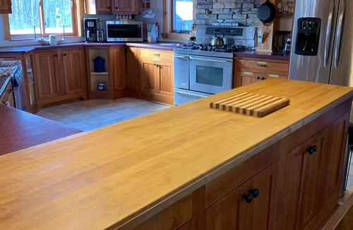 Back to the house: Step up to the fully equipped kitchen which has all stainless appliances along with a wine fridge and an 8' cutting board. The kitchen is a cooks dream. If it's lacking anything - lmk! It is open view to the great room, which has an oversized cozy window seat, big enough for 2 to lay down. From this space you can oversee your fur family in the Daj Mahal kennel or enjoy the birds. A soapstone gas fireplace also warms this space for fall guests. It's a grand feel in this room as the ceiling peak reaches 30'. We often just lay on the floor and look up at the cool joineries. There are double doors to the deck for outdoor dining. Under the arch you'll find the large dining space for 8, a fully equipped hutch for place settings and a buffet. Just through the pocket door you'll find the TV Room with a 60", 2 reclining chairs and a reclining double leather love seat. Behind the partial wall there is a Trundle bed for a midday nap, children or elderly who doesn't want to climb stairs.. This room has a small library for all ages and many games and puzzles.