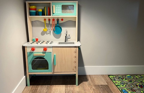 Privacy and peace abound in the home's primary en suite bedroom. Spend your evenings on the private balcony, gazing out at the water, before dipping into the soaking tub for a bubble bath. The little ones of the family will be pleased with the additional TV room and the play area, featuring a play kitchen, and other toys. Additional interior perks include a separate laundry room, central air-conditioning, a gas fireplace, a work desk, and internet access.