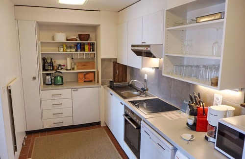 "Sans Nom", 5-room semi-detached house 120 m2 on 3 levels, south facing position. Object suitable for 4 adults + 2 children. Partly renovated in 2024, comfortable and beautiful furnishings: small living/dining room with open-hearth fireplace, cable TV, radio and CD-player. Exit to the terrace. Open kitchen (oven, dishwasher, 4 ceramic glass hob hotplates, toaster, kettle, microwave, freezer, electric coffee machine, Capsules for coffee machine (Nespresso) extra, raclette grill, fondue Set (chinoise, cheese)). Upper floor: 1 large room with 1 double bed (2 x 90 cm, length 200 cm). Exit to the balcony. 1 room with 1 bed (90 cm, length 190 cm). Bath/WC, sep. WC. 2nd upper floor: 1 room with sloping ceilings with 2 beds (90 cm, length 200 cm). 1 children's room with sloping ceilings with 1 bed (90 cm, length 190 cm). Shower/WC. Balcony 15 m2, south facing position and, east facing position, terrace 20 m2, south facing position. Terrace furniture, balcony furniture, barbecue (portable), deck chairs (1). Beautiful view of the mountains, the valley and the forest. Facilities: washing machine, iron, children's high chair, baby cot for up to 2 year olds, hair dryer. Internet (WiFi, free). Garage (1 car), height 195 cm, width 220 cm. Please note: non-smoking house. 1 small pet/ dog allowed.