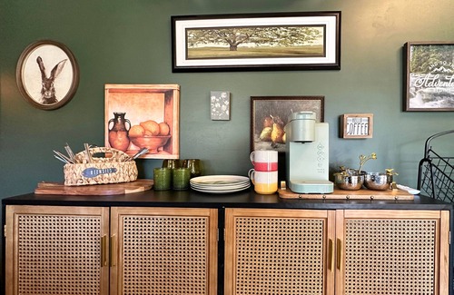 The Sassafras is a romantic dream with its bold jewel toned decor and cozy vibes. There is a comfortable loveseat couch, a reading corner, and 3 outdoor seating areas. The bedroom has a luxurious queen size bed, plenty of storage, and a private patio. The kitchenette is equipped with a hot plate, toaster oven, Keurig, cooking utensils, plates, cups, bowl, and everything you need for an amazing stay. The bathroom features a double headed shower and light up mirror. The kitchen area has a lovely automatic window that opens the space up to the main outdoor porch. There is a fire pit with perfect river views. You will find the Sassafras Container Tiny Home has everything you need for a perfect stay!