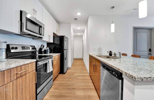 Step into style and comfort with thoughtfully designed spaces featuring luxurious wood-style flooring, stainless-steel appliances, and stunning tile backsplashes complemented by sleek granite countertops. Each home boasts high-powered Wi-Fi, a deluxe 65” flat-screen TV, and contemporary furnishings. Soaring nine-foot ceilings, designer lighting, and ceiling fans create an airy and inviting atmosphere.