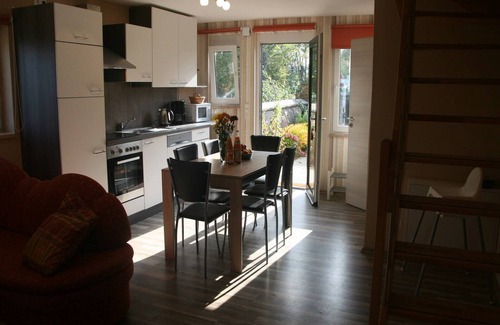 The half-detached house has its entrance and can accommodate a maximum of 6 people. The ground floor houses the living area with a well-equipped kitchenette and a guest toilet. The upper floor has 2 bedrooms and a bathroom with a shower and toilet. The half-detached house has its own sun terrace with garden furniture and a barbecue. A shared children's playground is located directly next to the house. The shared playground is located at the host's neighboring country house. Here, guests' children can play and romp to their heart's content._x000D_
