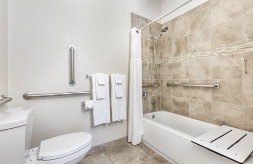 This mobility accessible suite includes an accessible bathtub. Recharge comfortably in our cozy one bedroom suite with king bed. The separate living area features a TV with DVD player, balcony, queen sofabed, and dining table. The fully equipped kitchen includes a refrigerator, stove/oven, dishwasher, coffeemaker, microwave, toaster, plus utensils. Sleeps 4.
