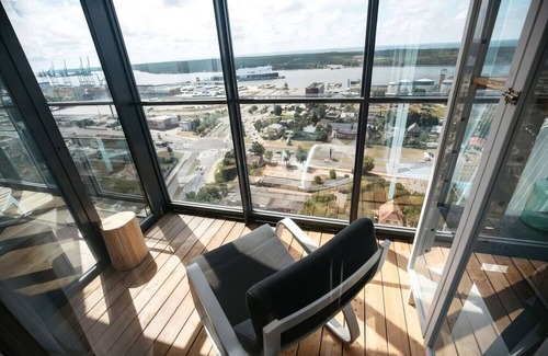 Experience Klaipėda from the 24th floor in this stylish apartment. Wake up to stunning sea views from your private balcony, and enjoy modern comforts like air conditioning, free WiFi, and a fully equipped kitchen. The spacious one-bedroom retreat includes a cozy dining area, flat-screen TV, and a sleek bathroom with linens and towels provided. Just steps away from the Ferry, Akropolis and old town attractions, this tranquil, non-smoking haven is perfect for a relaxing or business getaway.