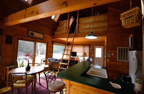 This delightful one-bedroom, one-bathroom cabin on the Boardman River accommodates up to four guests and is open all year round. This is a breathtaking location on the river, and its soothing sounds can be heard throughout the cabin.