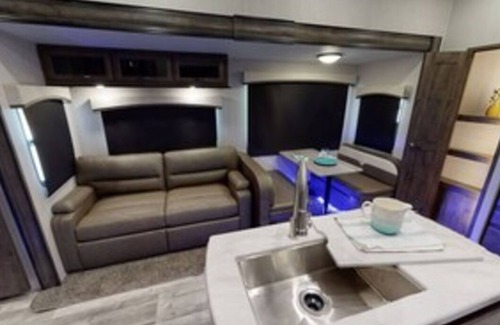 This RV is the PERFECT destination for you family vacation! It's a 2021 fifth wheel two bedroom RV with top-notch amenities like a huge 16 cu. ft. fridge, separate bedroom with loft above, pull-out sofa in lounge and a convertible dinette for extra sleeping room!! NO SETUP REQUIRED; just show up and enjoy!!